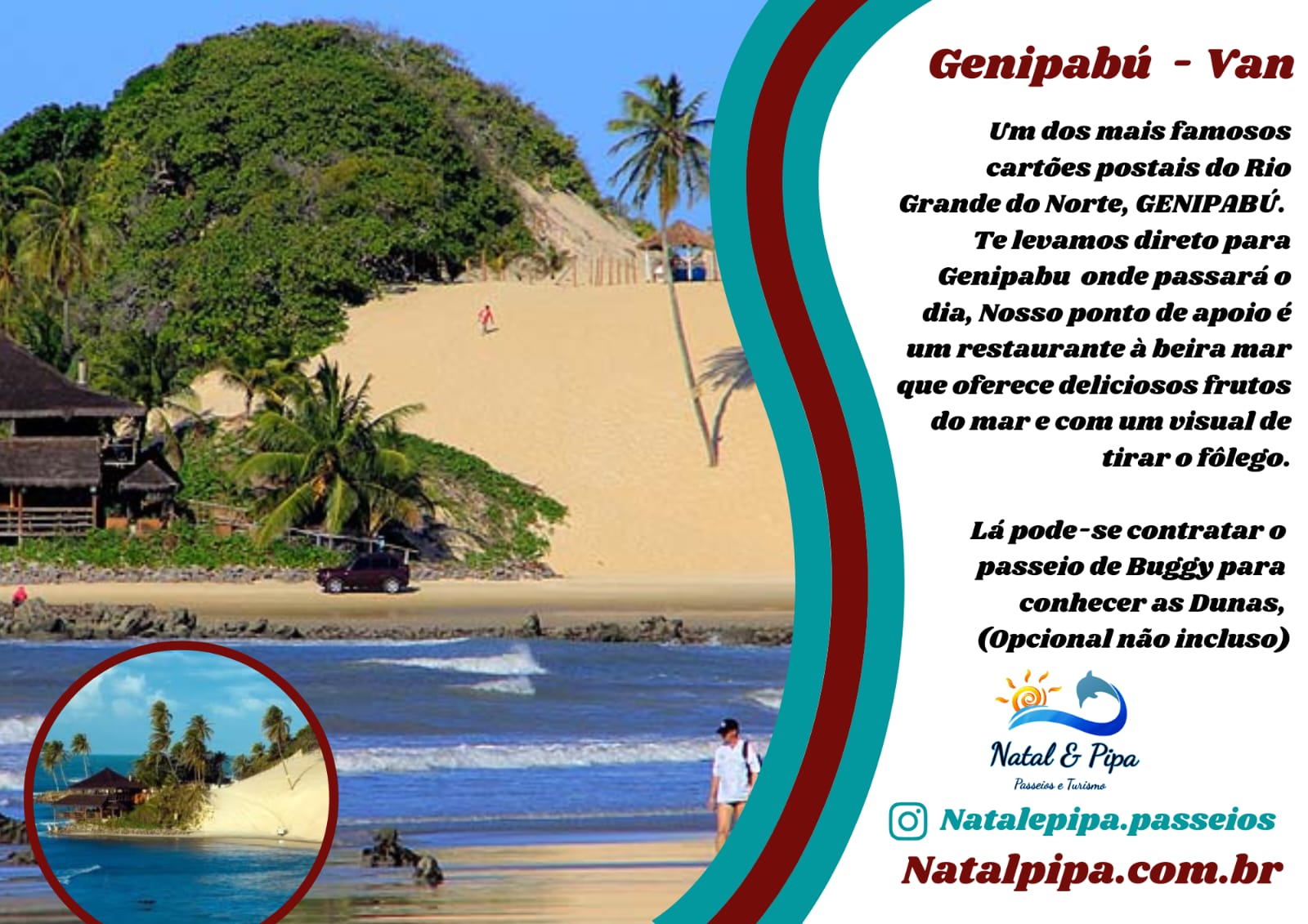 O veículo utilizado depende da quantidade de pessoas reservadas para o dia, podendo ser em van, micro-ônibus ou ônibus.São 30 km até GenipabuO QUE ESTÁ INCLUSOTransporteGuia de Turismo RNSeguro passageiroO QUE NÃO ESTÁ INCLUSO (Serviços Terceirizados / os valores estão sujeitos a alteração de acordo com o período)Alimentos e bebidas.AlmoçoPasseio de Buggy pelas dunas móveis ou fixasRECOMENDAÇÕES